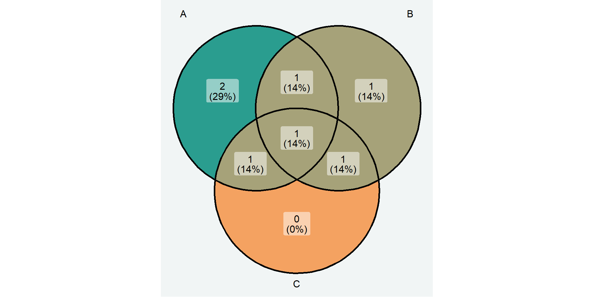 Sea un conjunto \(A=\{0, 1, 2, 3, 4\}\), uno \(B=\{3, 4, 5, 6\}\) y uno \(C=\{1, 3, 5\}\).