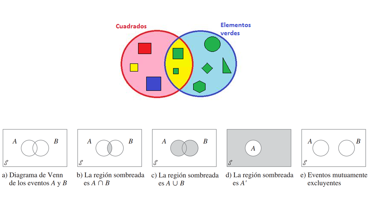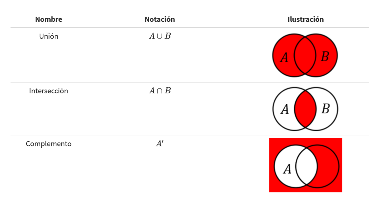 Complemento: de un evento A, denotado por 𝐴′, es el conjunto de todos los eventos del espacio muestral S que no están contenidos en A.
