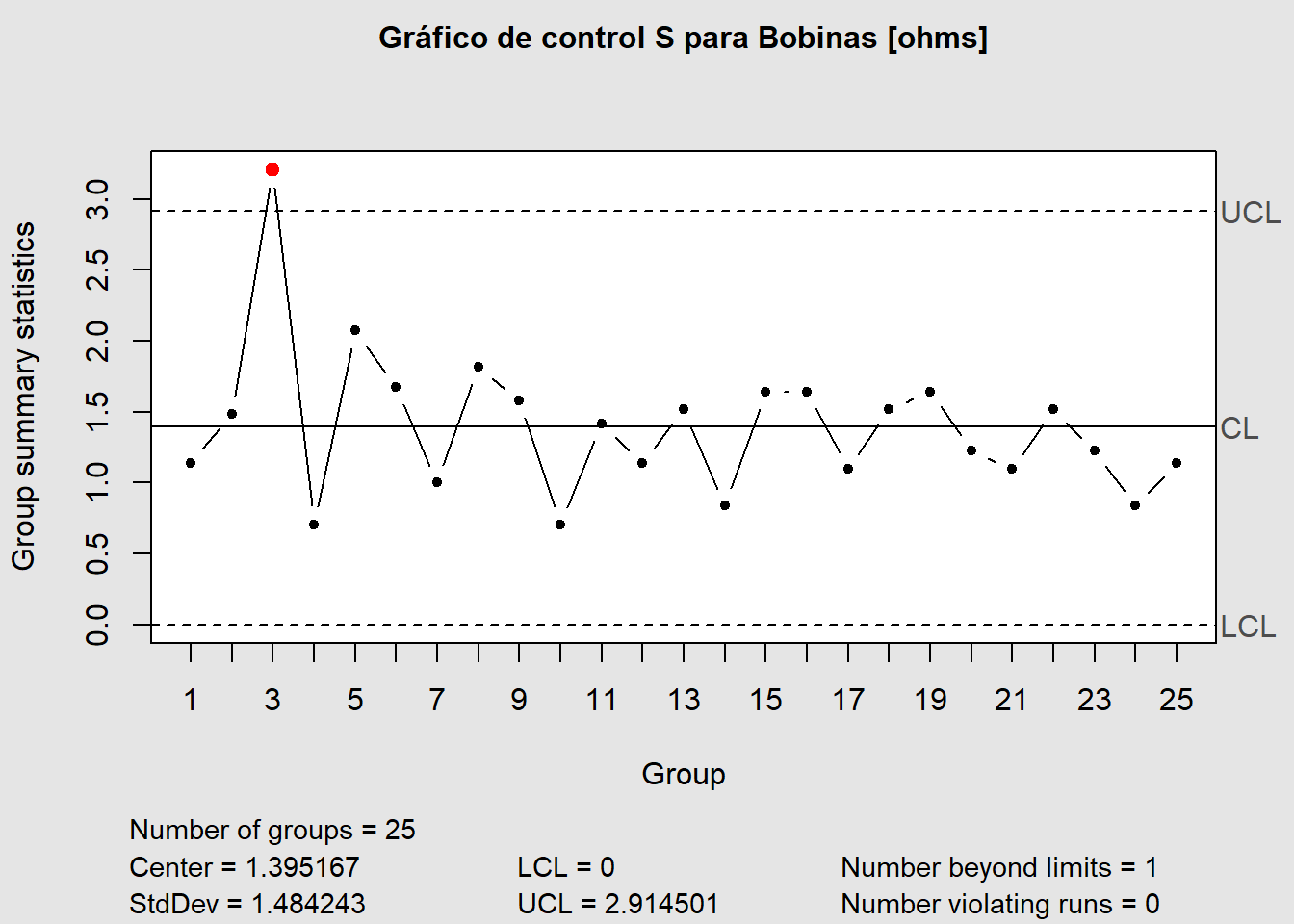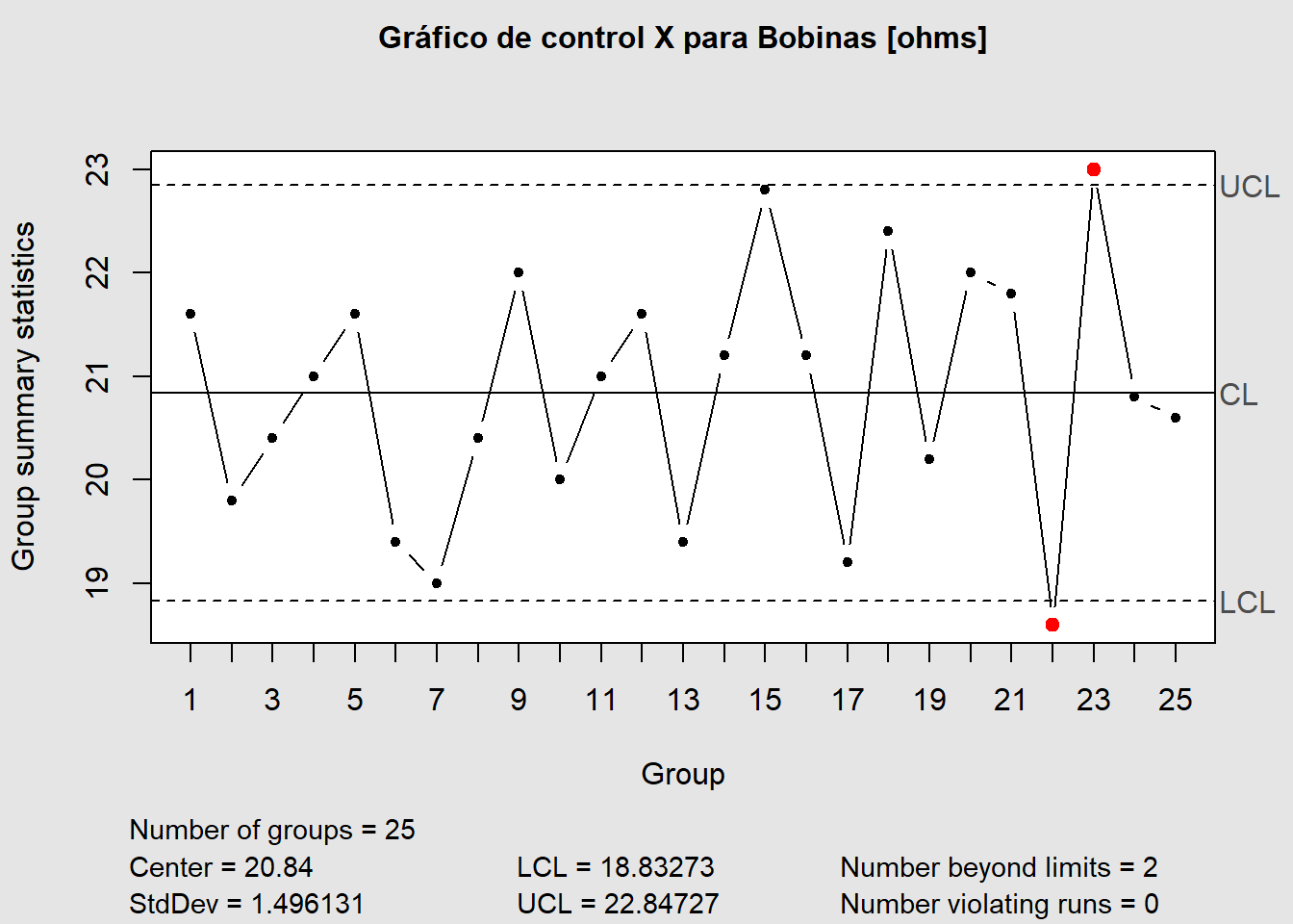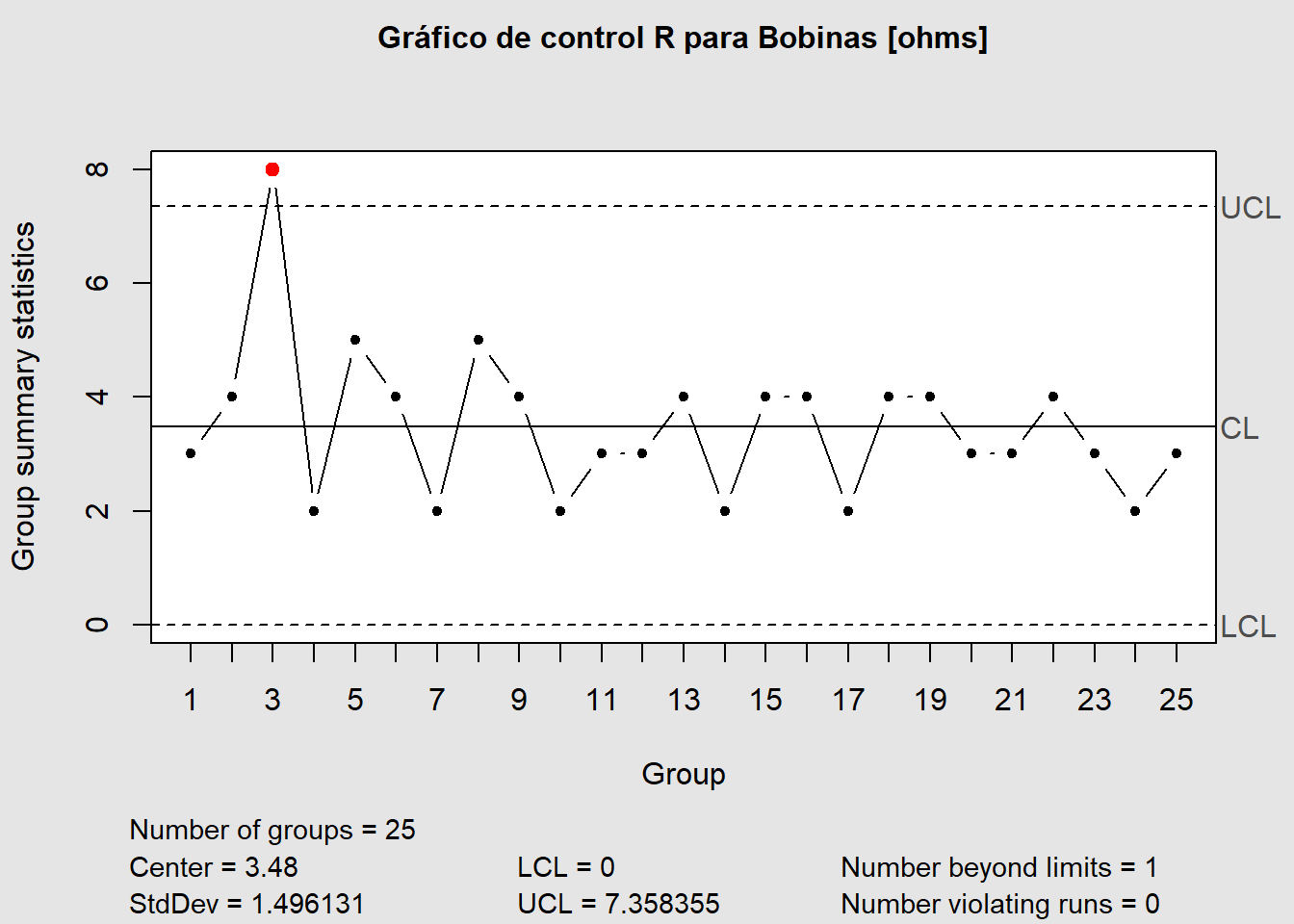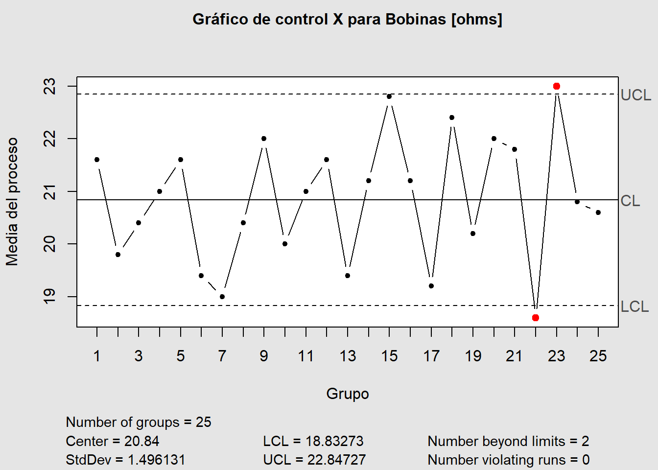 Para ejemplificar el uso de este gráfico se emplean los siguientes datos sobre fabricación de bobinas. Para cada bobina muestreada se mide la resistencia en ohms.