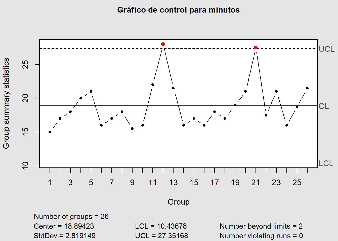 ImR <- qcc::qcc(minutos, type = "xbar.one", std.dev = "MR",