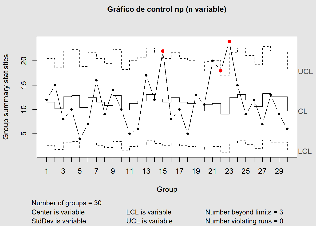 title = "Gráfico de control np (n variable)")